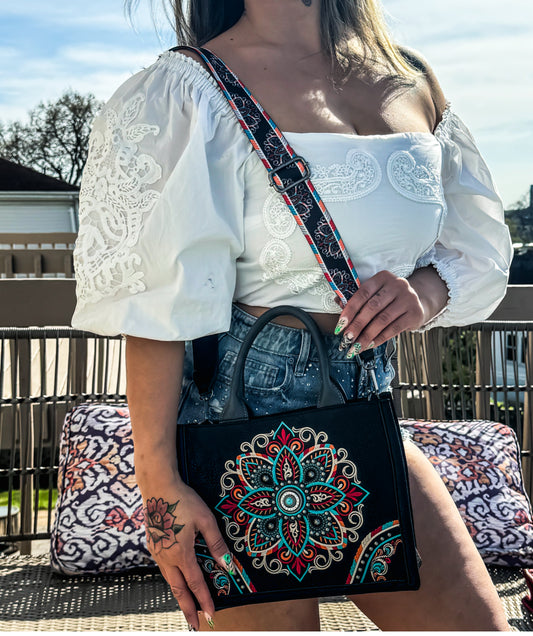 Mandala Carry Everywhere Purse Black Satchel Tote with Strap