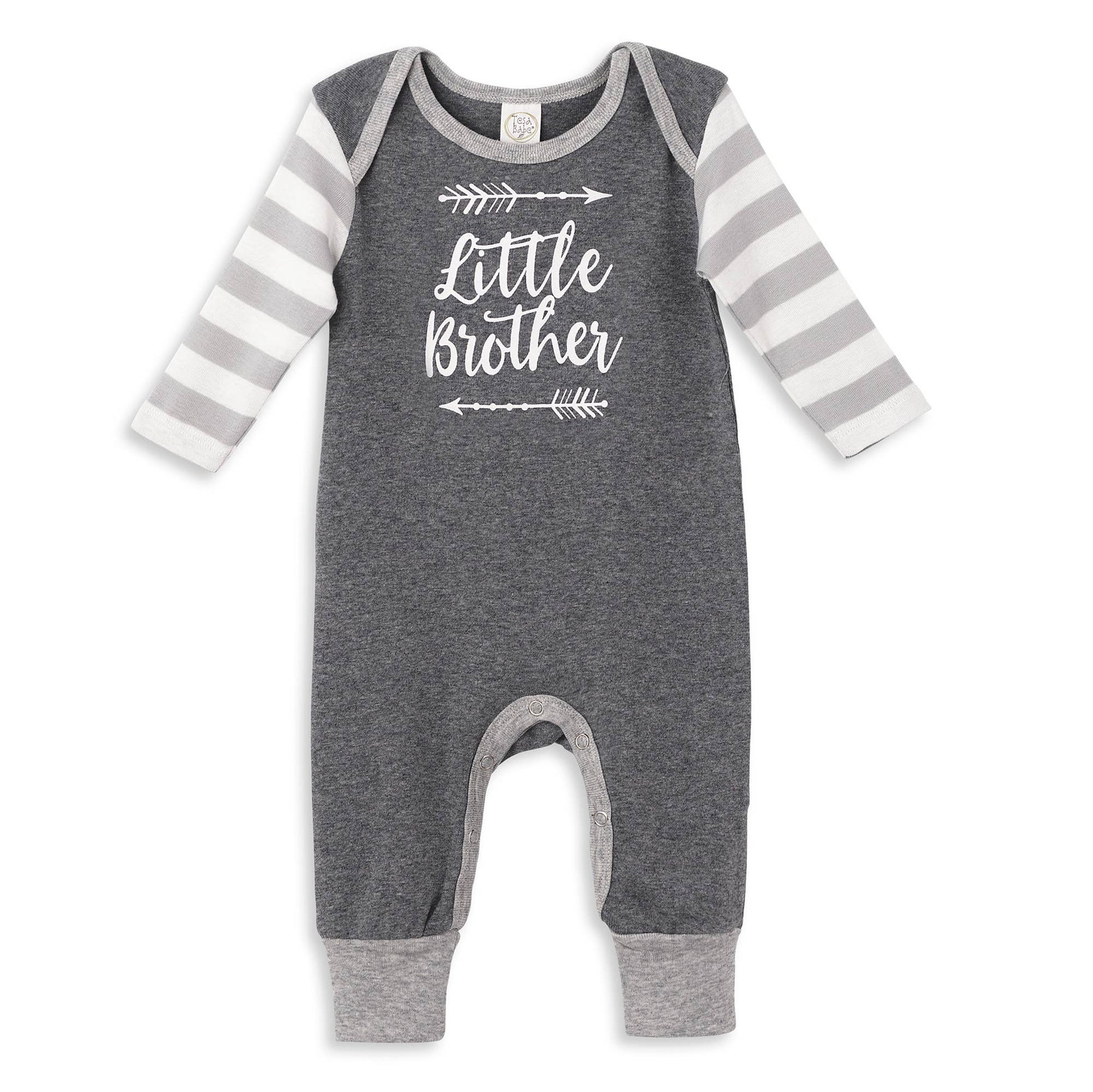 Baby boy romper with "Little Brother" front graphic and grey stripe trim.  Soft and stretchy 100%  cotton rib material is oh-so-gentle against baby's skin. Romper snaps underneath for changing ease.