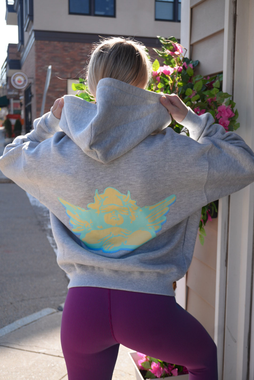 Boys Lie light heather gray hoodie with pastel logo on front, pastel cherub logo graphic on back.