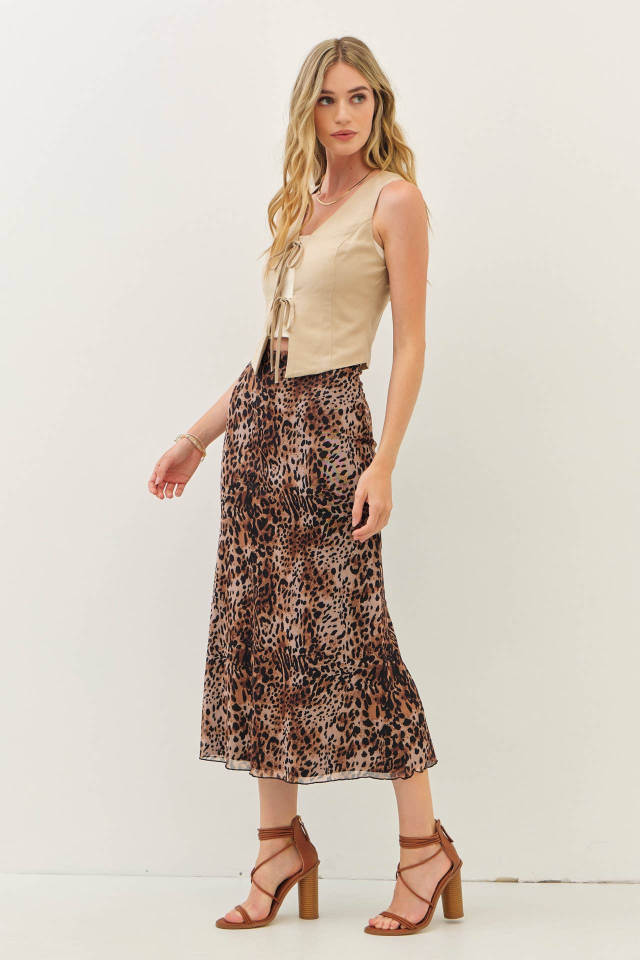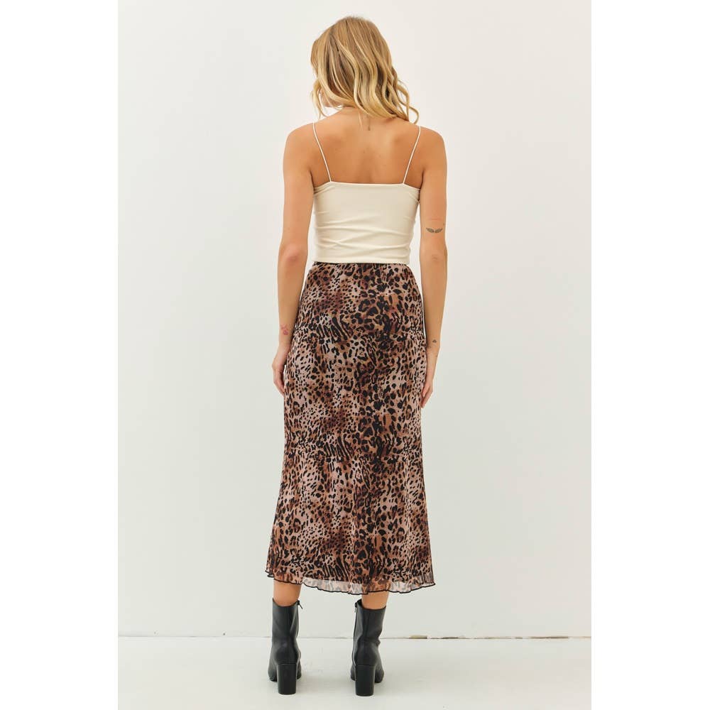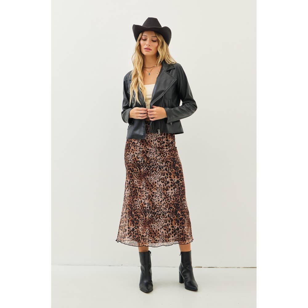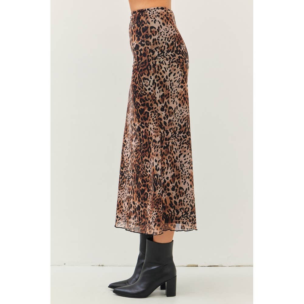 Effortlessly chic midi skirt in a leopard animal print and stretchy mesh with full lining. Elastic waist with merrow hem for added dimension. Poly/spandex. Fitted at hips and true to size.